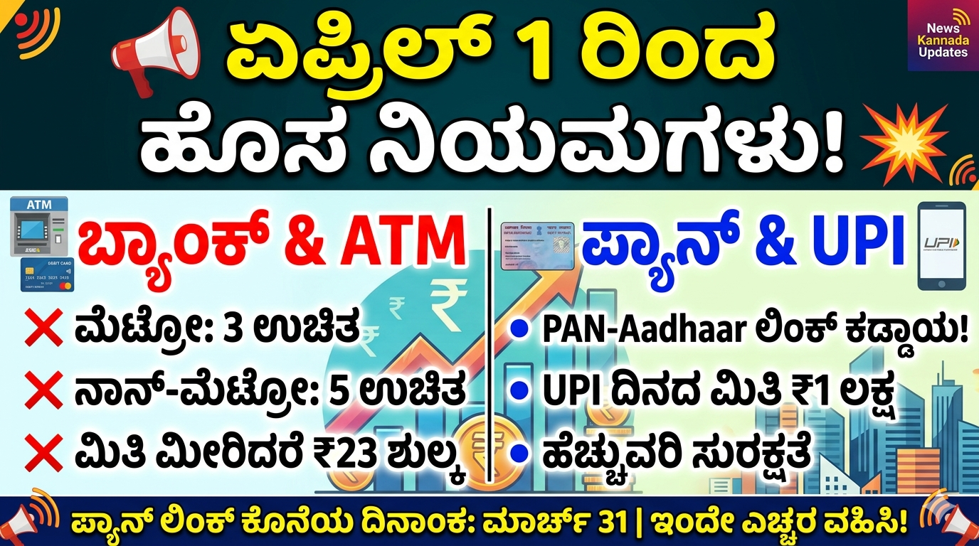 ATM ನವದೆಹಲಿ, ಮಾರ್ಚ್ 27, 2026: ಭಾರತದಲ್ಲಿ ಪ್ರತೀ ವರ್ಷ ಏಪ್ರಿಲ್ 1ರಿಂದ ಹೊಸ ಹಣಕಾಸು ವರ್ಷ (Financial Year) ಆರಂಭವಾಗುತ್ತದೆ. ಇದೇ ಹಿನ್ನೆಲೆಯಲ್ಲಿಯೇ ಏಪ್ರಿಲ್ 1, 2026ರಿಂದ ಹಲವಾರು ಪ್ರಮುಖ ಬ್ಯಾಂಕಿಂಗ್ ಮತ್ತು ಹಣಕಾಸು ಸಂಬಂಧಿತ ನಿಯಮಗಳು ಜಾರಿಯಾಗಲಿವೆ. ಈ ಬದಲಾವಣೆಗಳು ಸಾಮಾನ್ಯ ಜನರ ದಿನನಿತ್ಯದ ವ್ಯವಹಾರಗಳ ಮೇಲೆ ನೇರ ಪರಿಣಾಮ ಬೀರುವ ಸಾಧ್ಯತೆ ಇದೆ. ATM ಬಳಕೆ, PAN ಕಾರ್ಡ್, UPI ಪಾವತಿ ಮತ್ತು ಬ್ಯಾಂಕ್ ಖಾತೆಗಳ ನಿಯಮಗಳಲ್ಲಿ ಆಗುತ್ತಿರುವ ಬದಲಾವಣೆಗಳನ್ನು ತಿಳಿದುಕೊಳ್ಳುವುದು ತುಂಬಾ ಮುಖ್ಯವಾಗಿದೆ.