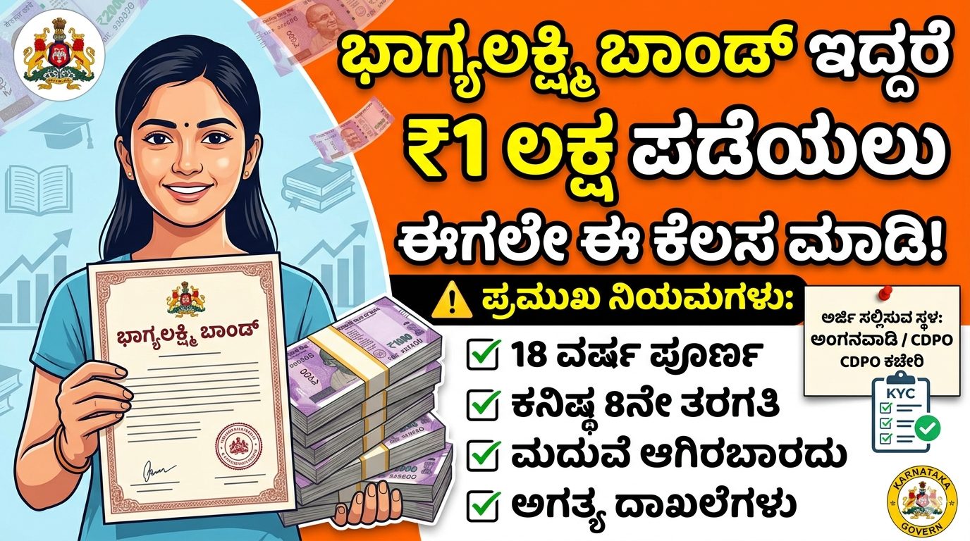 Bhagyalakshmi Scheme ಕರ್ನಾಟಕ ಸರ್ಕಾರದ ಪ್ರಮುಖ ಯೋಜನೆಯಾದ ಭಾಗ್ಯಲಕ್ಷ್ಮಿ ಯೋಜನೆಯಡಿ ಈಗ ಮಗಳ 18 ವರ್ಷ ಪೂರ್ಣವಾದ ನಂತರ ಸುಮಾರು ₹1 ಲಕ್ಷದವರೆಗೆ ಹಣ ಪಡೆಯುವ ಅವಕಾಶ ಇದೆ. ಆದರೆ ಈ ಹಣ ಪಡೆಯಲು ಕೆಲವು ಮುಖ್ಯ ನಿಯಮಗಳು ಮತ್ತು ಕ್ರಮಗಳನ್ನು ಕಟ್ಟುನಿಟ್ಟಾಗಿ ಪಾಲಿಸಬೇಕು. ಇಲ್ಲವಾದರೆ ನಿಮ್ಮ ಅರ್ಜಿ ತಿರಸ್ಕೃತವಾಗುವ ಸಾಧ್ಯತೆ ಇದೆ.