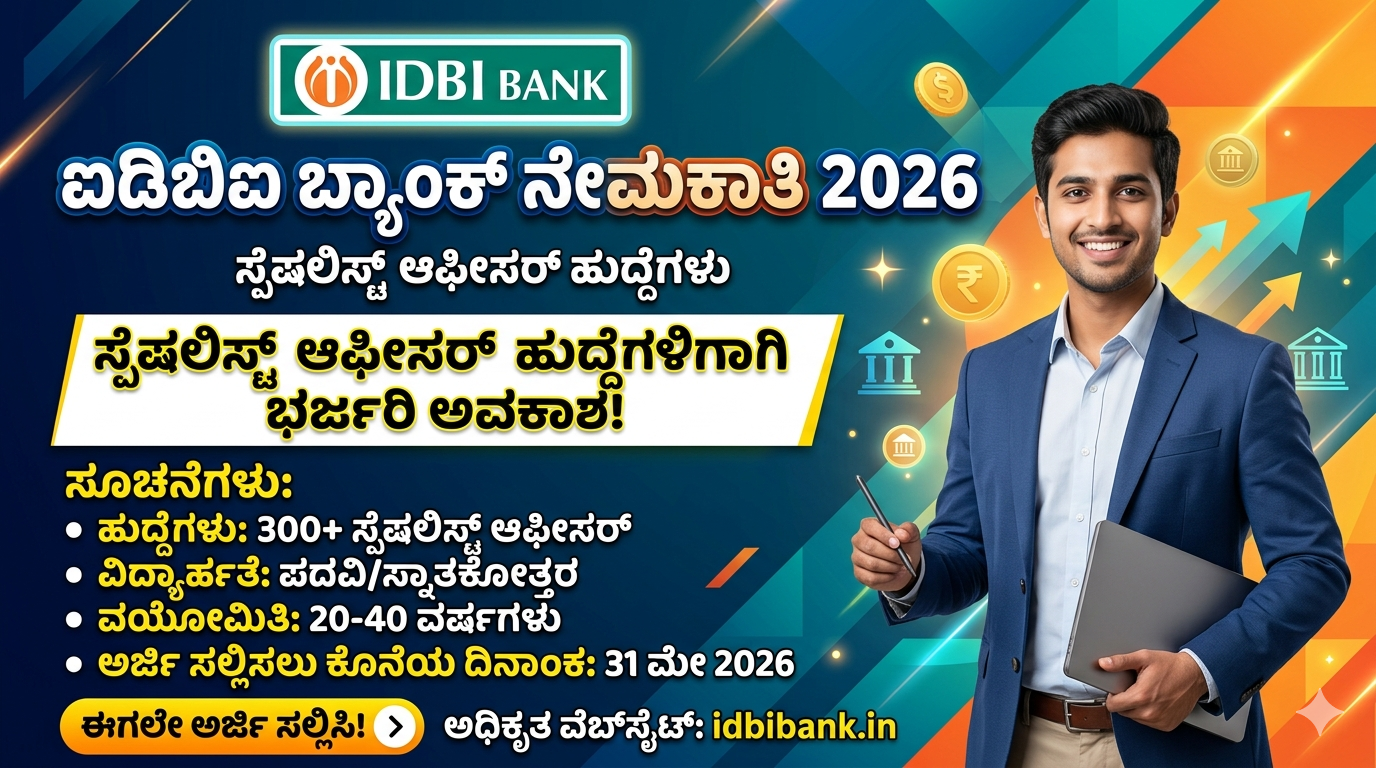IDBI ಭಾರತದ ಪ್ರಮುಖ ಬ್ಯಾಂಕ್‌ಗಳಲ್ಲಿ ಒಂದಾದ ಐಡಿಬಿಐ ಬ್ಯಾಂಕ್ (IDBI Bank) ಇದೀಗ 2026ನೇ ಸಾಲಿನ ಸ್ಪೆಷಲಿಸ್ಟ್ ಆಫೀಸರ್ ನೇಮಕಾತಿಗೆ ಅರ್ಜಿ ಆಹ್ವಾನಿಸಿದೆ. ಬ್ಯಾಂಕಿಂಗ್ ಕ್ಷೇತ್ರದಲ್ಲಿ ಉತ್ತಮ ಕರಿಯರ್ ನಿರ್ಮಿಸಿಕೊಳ್ಳಲು ಬಯಸುವ ಅಭ್ಯರ್ಥಿಗಳಿಗೆ ಇದು ದೊಡ್ಡ ಅವಕಾಶವಾಗಿದೆ. ಆಸಕ್ತರು ಅರ್ಜಿ ಸಲ್ಲಿಸುವ ಮೊದಲು ಎಲ್ಲಾ ಮಾಹಿತಿಯನ್ನು ಗಮನವಿಟ್ಟು ಓದಿ, ಅರ್ಹತೆಗಳನ್ನು ಪರಿಶೀಲಿಸಿ ಅರ್ಜಿ ಸಲ್ಲಿಸುವುದು ಅಗತ್ಯ.