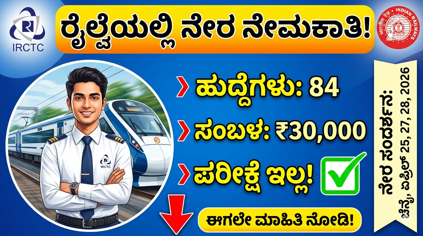 IRCTC ರೈಲ್ವೆ ಇಲಾಖೆಯಲ್ಲಿ ಕೆಲಸ ಮಾಡುವ ಕನಸು ಹೊಂದಿರುವ ಯುವಜನತೆಗೆ ಇದೀಗ ಉತ್ತಮ ಅವಕಾಶ ಸಿಕ್ಕಿದೆ. ಭಾರತೀಯ ರೈಲ್ವೆಯ ಅಂಗಸಂಸ್ಥೆಯಾದ IRCTC ವತಿಯಿಂದ ದಕ್ಷಿಣ ಭಾರತದಲ್ಲಿ ದೊಡ್ಡ ಮಟ್ಟದ ನೇಮಕಾತಿ ಪ್ರಕಟವಾಗಿದ್ದು, ಯಾವುದೇ ಲಿಖಿತ ಪರೀಕ್ಷೆ ಇಲ್ಲದೇ ನೇರ ಸಂದರ್ಶನದ ಮೂಲಕ ಉದ್ಯೋಗ ಪಡೆಯುವ ಅವಕಾಶ ಕಲ್ಪಿಸಲಾಗಿದೆ. ಕರ್ನಾಟಕ ಸೇರಿದಂತೆ ಕೇರಳ ಮತ್ತು ತಮಿಳುನಾಡಿನಲ್ಲಿ ಕೆಲಸ ಮಾಡಲು ಆಸಕ್ತಿ ಇರುವ ಅಭ್ಯರ್ಥಿಗಳಿಗೆ ಇದು ಒಳ್ಳೆಯ ಸುದ್ದಿ.