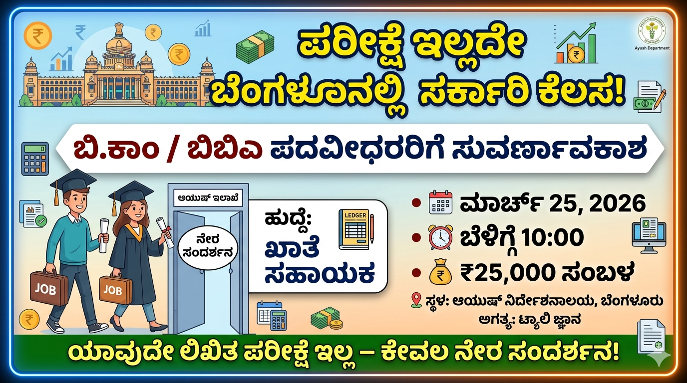 jobs ಡಿಗ್ರಿ ಮುಗಿಸಿ ಉತ್ತಮ ಉದ್ಯೋಗದ ಹುಡುಕಾಟದಲ್ಲಿದ್ದೀರಾ? ವಿಶೇಷವಾಗಿ ವಾಣಿಜ್ಯ (Commerce) ವಿಭಾಗದಲ್ಲಿ ಓದಿದ್ದವರಿಗೆ ಈಗ ಒಂದು ಉತ್ತಮ ಅವಕಾಶ ಬಂದಿದೆ. ಬೆಂಗಳೂರಿನಲ್ಲಿರುವ ಆಯುಷ್ ಇಲಾಖೆಯಲ್ಲಿ (Ayush Department) ಖಾಲಿ ಇರುವ ಹುದ್ದೆಗಳಿಗೆ ಯಾವುದೇ ಲಿಖಿತ ಪರೀಕ್ಷೆ ಇಲ್ಲದೆ ನೇರ ಸಂದರ್ಶನದ ಮೂಲಕ ನೇಮಕಾತಿ ನಡೆಯುತ್ತಿದೆ.