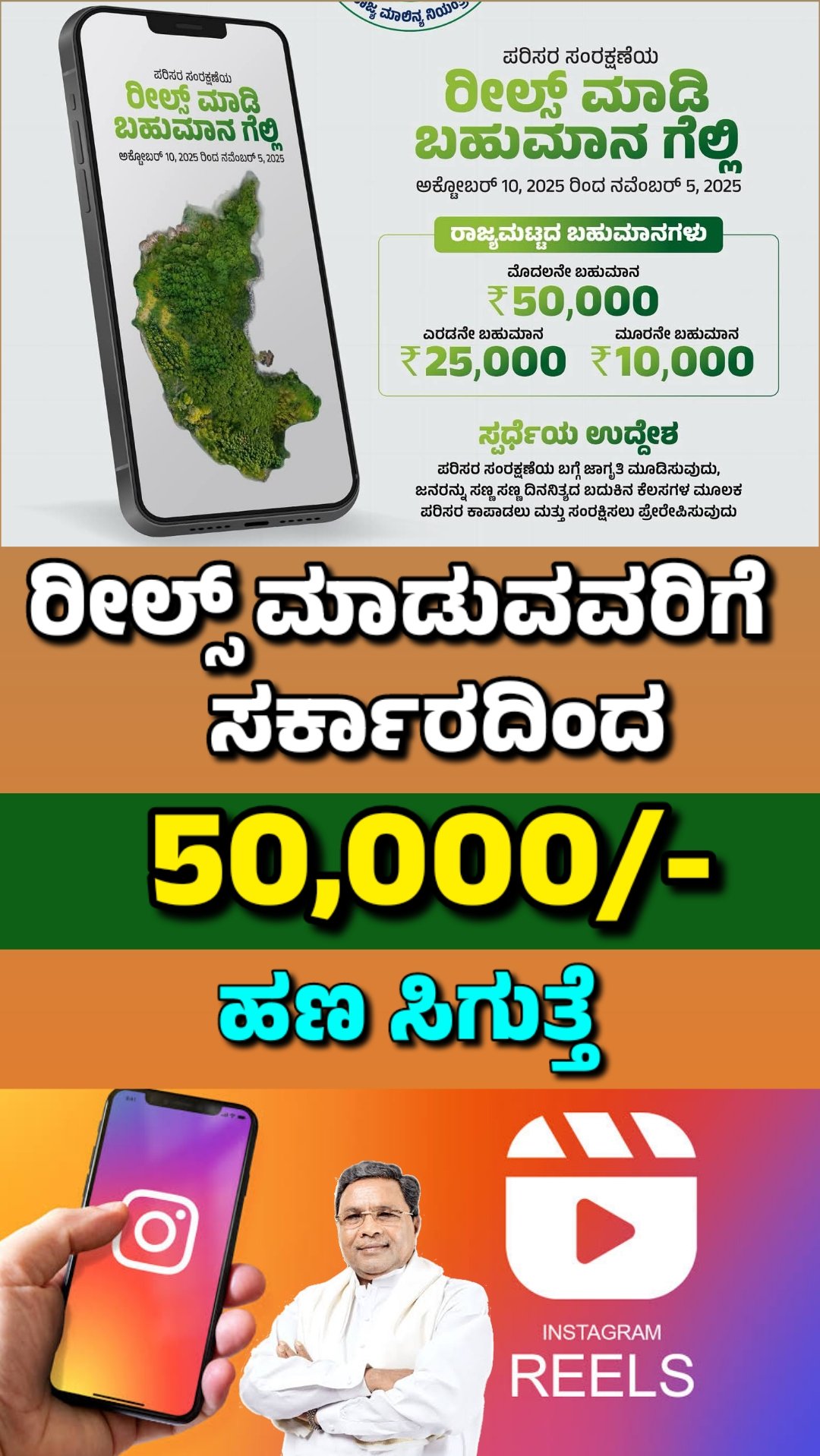 ಕರ್ನಾಟಕ ರೀಲ್ಸ್ ಸ್ಪರ್ಧೆ 2025 – ಪರಿಸರ ಸಂರಕ್ಷಣೆ ಕುರಿತು ರೀಲ್ಸ್ ಮಾಡಿ ₹50,000 ಬಹುಮಾನ ಗೆಲ್ಲಿ!