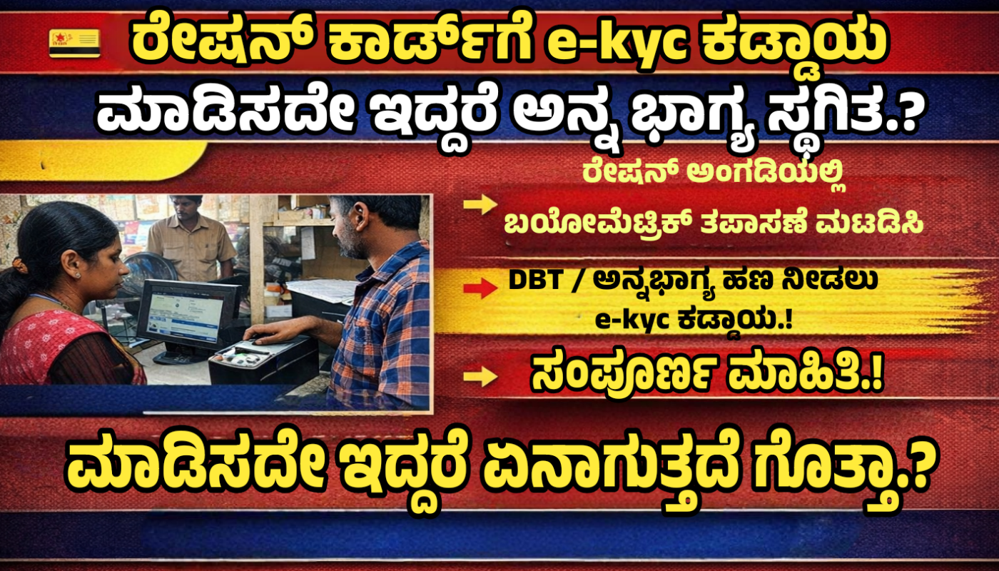 Ration card ಇತ್ತೀಚಿನ ದಿನಗಳಲ್ಲಿ ರಾಜ್ಯದ ಹಲವಾರು ರೇಷನ್ ಕಾರ್ಡ್ ಹೊಂದಿರುವ ಕುಟುಂಬಗಳಿಗೆ e-KYC ಮಾಡುವ ಬಗ್ಗೆ ಸಂದೇಶಗಳು ಬರುತ್ತಿವೆ. ಹಲವರಿಗೆ ಗೊಂದಲ – “e-KYC ಮಾಡಿಸದಿದ್ದರೆ ಅನ್ನಭಾಗ್ಯ ಯೋಜನೆಯ ಹಣ ನಿಲ್ಲುತ್ತದೆಯೇ?” ಎಂಬ ಪ್ರಶ್ನೆ.
